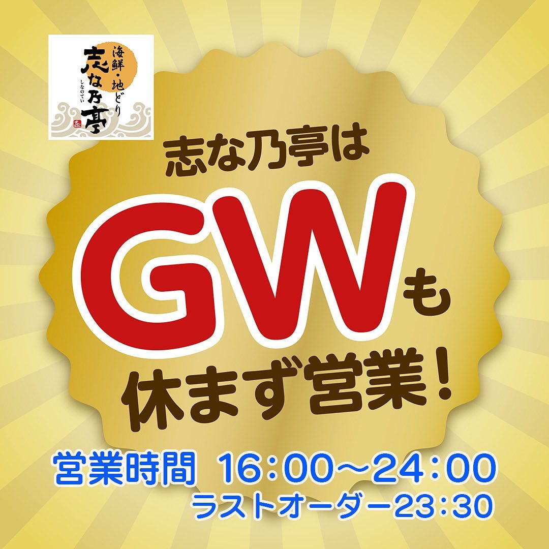 GW通常営業やってます!明日からは楽しいGW♪さぁどこへでかけましょうか🚘#志な乃亭 はGWも休まず営業ゴールドステッカー認証店ですので安心してご来店ください大阪府からの要請に応じて「1テーブル4人まで」を実践しているため#志な乃亭野田阪神店 では1グループ最大56名様までとさせていただいていますご協力をお願いいたします産直鮮魚の新鮮お刺身やアテになるお寿司もたくさん揃えてご来店をお待ちしております============営業時間 16:00~24:00 ラストオーダー23:30#居酒屋野田阪神志な乃亭 #野田阪神グルメ #野田阪神飲み #大きな座敷で #活け造り #刺身 #寿司 #飲み放題 #野田グルメ #海老江グルメ