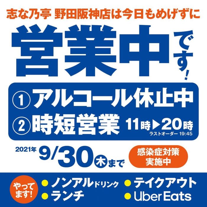 緊急事態宣言再延長にともない9月30日(木)まで「時短営業」11時~20時まで(ラストオーダー15分前)期間中、アルコールの提供は休止といたしますまたか…という…