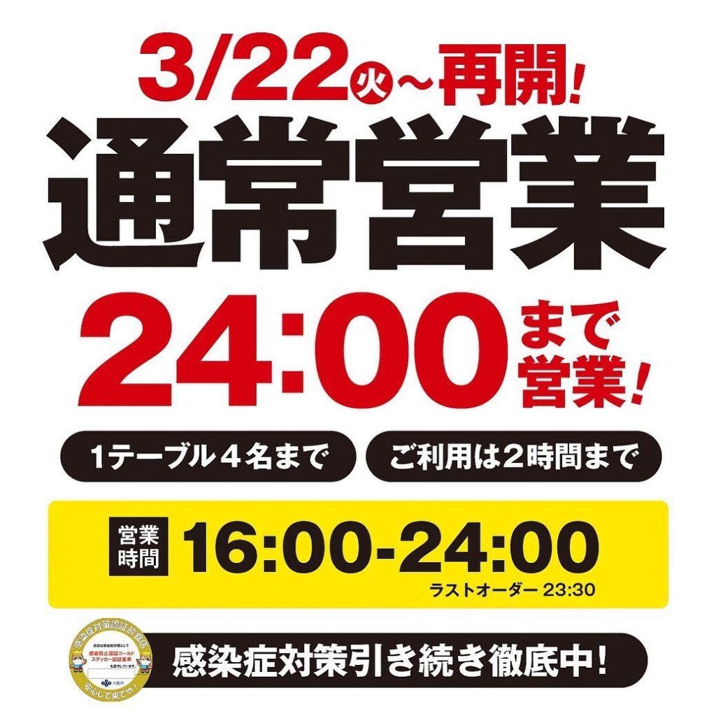 大阪府のまん延防止措置再延長にともない時短営業を3月21日まで継続します★営業時間 16:00~21:00・アルコールの提供20:30まで・1テーブル4人まで=…