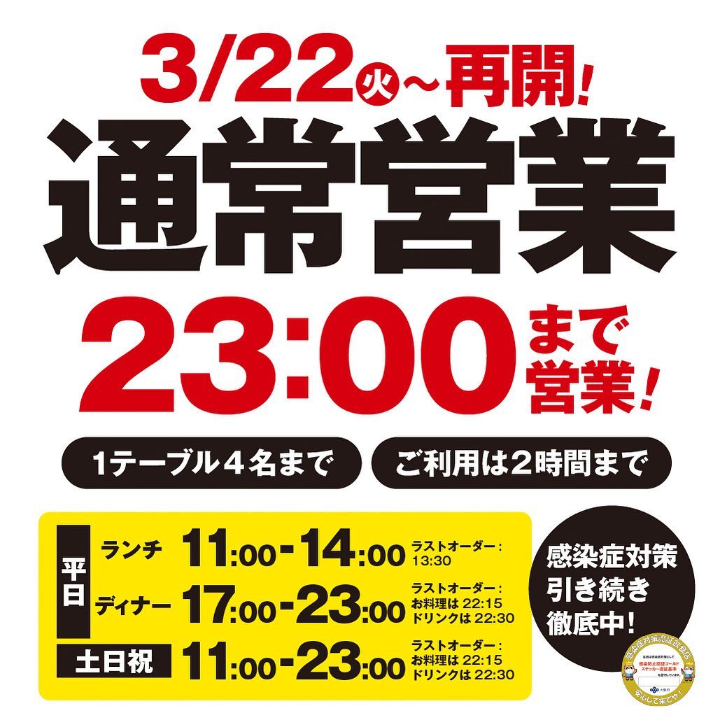 通常営業に戻りました~やったね大阪府のまん延防止解除にともない#通常営業 に戻ります♪営業時間平日 11:00~14:00/17:00~23:00土日祝 11:00~23:00#志な乃亭鶴見本店 はゴールドステッカー#認証店 です・1テーブル4人まで・滞在時間2時間程度にご協力ください本物の春が来ましたね🥰これで気兼ねなく飲んでいただけるご来店お待ちしています#居酒屋鶴見志な乃亭 #鶴見グルメ #鶴見ランチ #鶴見区グルメ #鶴見区ランチ #鶴見緑地 #週末昼飲み #個室 #駐車場完備 #飲酒運転ダメです ♂️