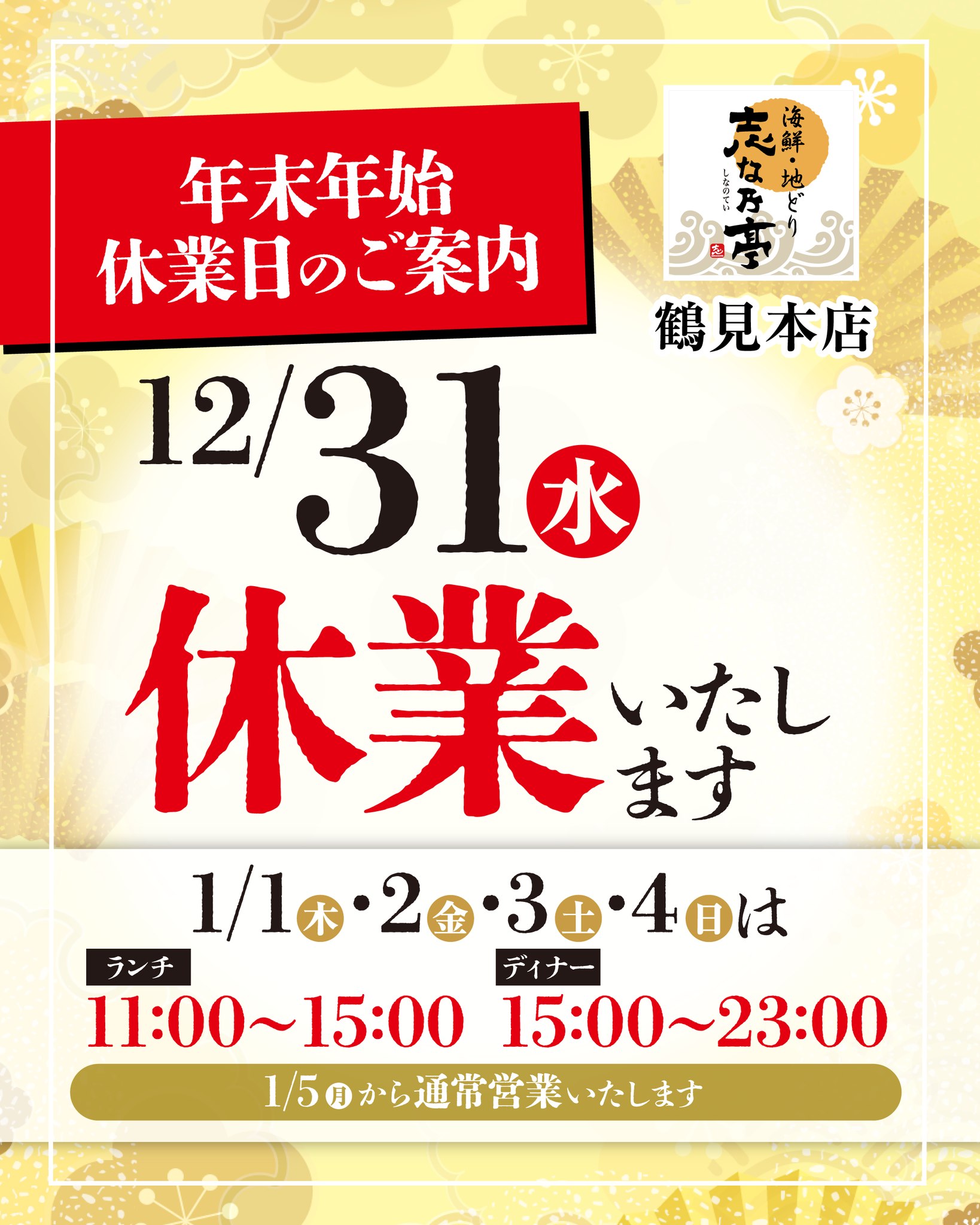 【年末年始の営業に関するご案内】★ 志な乃亭 鶴見本店